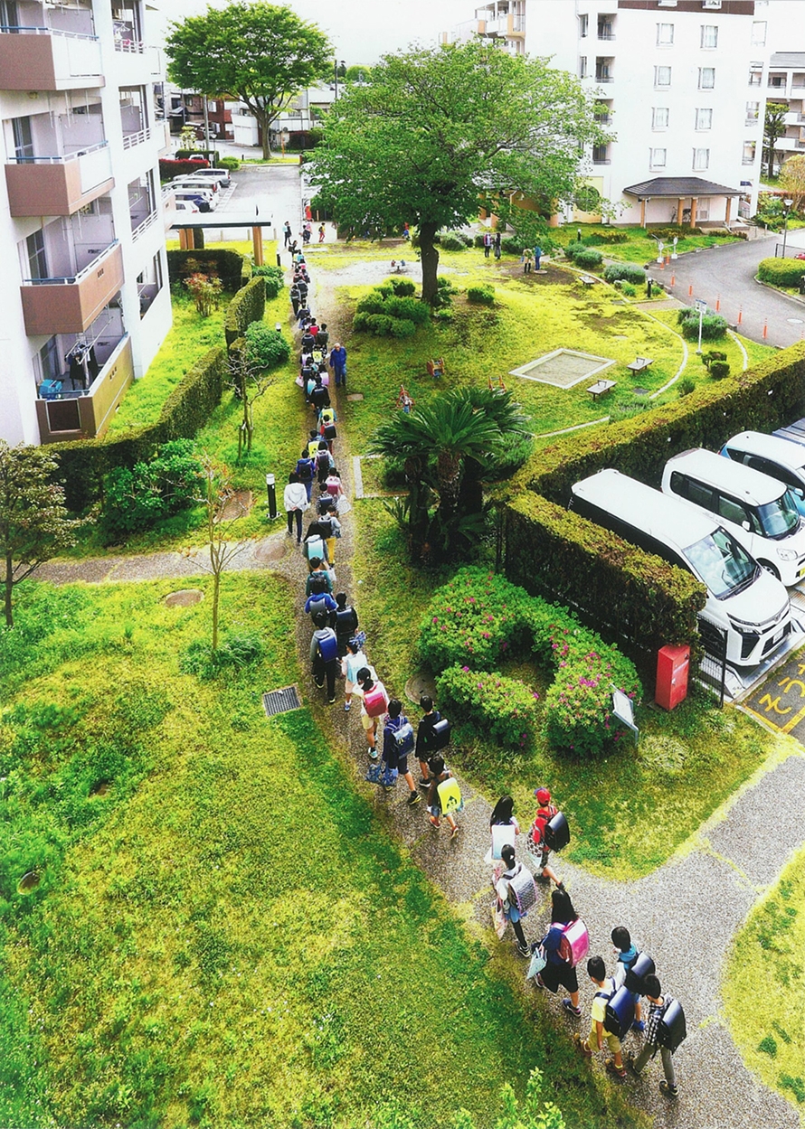 写真から子ども達の声が聞こえてきそうな集団での通学風景。団地のベランダから見下ろしている構図が見守る撮影者と子ども達との関係を現わしており、ほほえましい。緑豊かなUR団地内の通学路を子ども達がゆるやかにカーブしながら一緒に歩いていく朝の時間は、団地の記憶として継承されているのであろう。コロナ前に撮影された写真を見て、この日常を早くとり戻したいと感じた一枚。