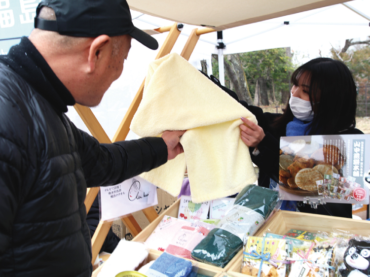 福島県からは地元産の米から作られた甘酒や、大熊町の人気キャラクター「まあちゃん」グッズ、歯ごたえ抜群のせんべい、ふわふわの手ざわりと吸水性が人気のタオルなどが大熊町、喜多方市、双葉町から届けられました。