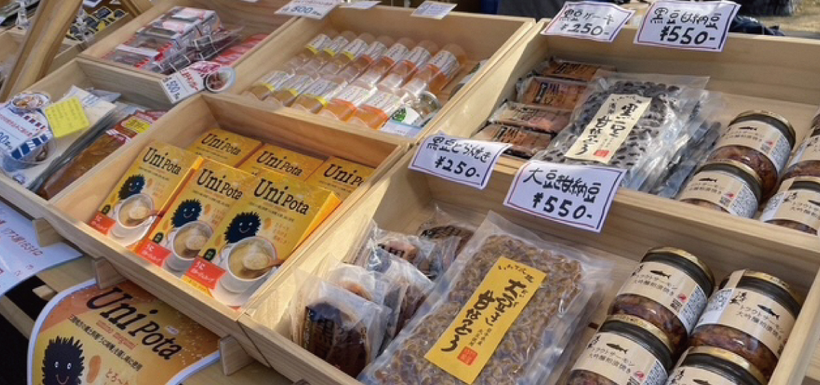 岩手県からは久慈市、釜石市、宮古市の地域の特色を活かした人気の商品が届けられました。黒豆を様々な形で楽しめるように商品化された黒豆どら焼き、平庭高原はちみつや飲む白樺樹液、旨みがやみつきになるトラウトサーモン大吟醸粕漬焼きやUni pota(ウニポタージュ)、三陸鉄道株式会社の三鉄カリーを始めとする食品と列車型グッズなど魅力満載です。
