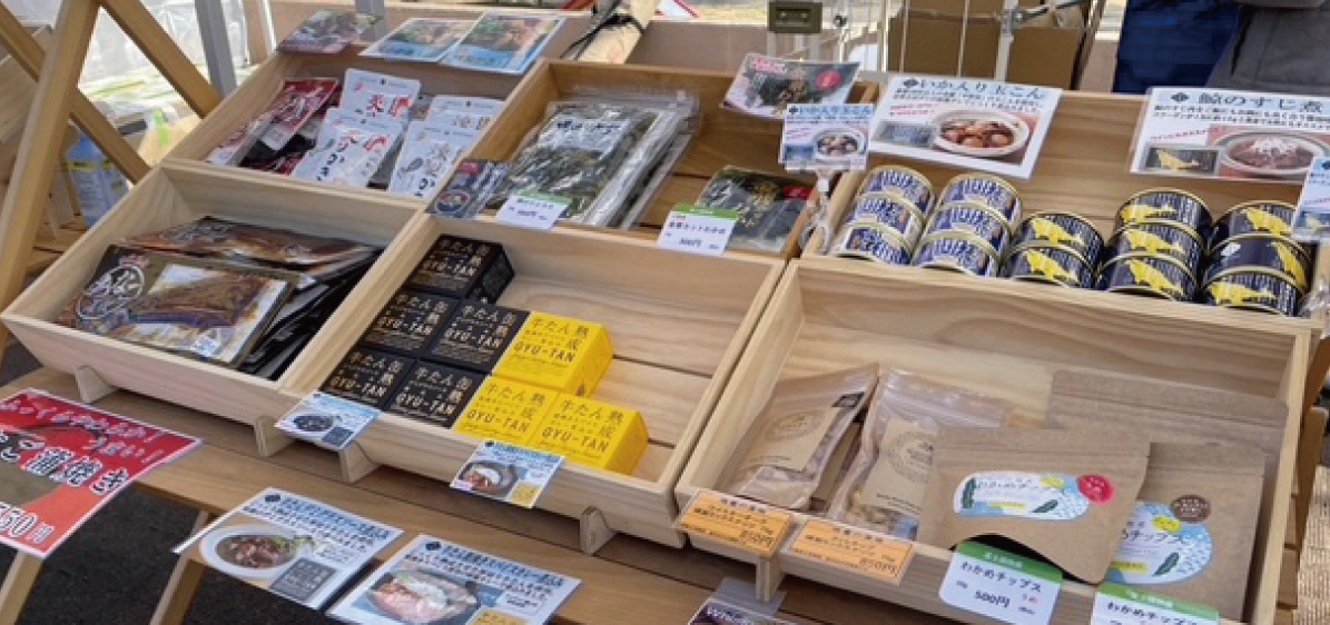宮城県からは地元の新鮮な素材を活かして作られた、おつまみ牛たん、炙りかき、燻製ミックスナッツ、あなご蒲焼、旨さをとじこめた缶詰やご飯のお供に最適な商品などが塩釜市、石巻市から届けられ、ずらりと並びました。