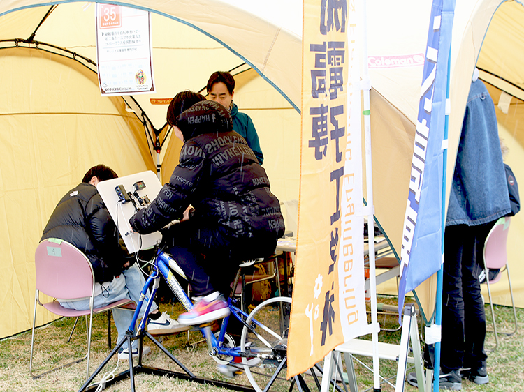サレジオ工業高等専門学校では、自転車を一生懸命漕いでスマホを充電中!