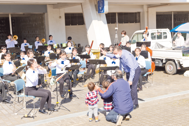12時になると会場中央で、「坂戸市立住吉中学校」の吹奏楽部による演奏が始まりました。『sing sing sing』や『テキーラ』など、誰もが知っている曲を披露し、多くの人が楽しそうに聴いています。途中、来場者がURのCMソングの指揮を体験できるコーナーもあり、子どもから大人まで楽しそうに腕を振っていました。