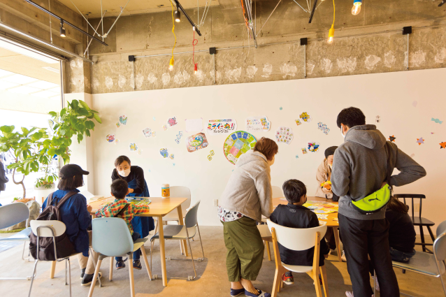 団地センター広場に面した空き施設が地域交流スペースに生まれ変わり、様々な企画が行われています。この地域交流スペースはオープンしたばかりだそうで、入口では団地自治会の皆さんが地域交流スペースの名前や使用目的を募集。来場者が書いたアイデアが次々と壁に貼られていきます。「黒板の絵も地元の住吉中学校の生徒たちが描いてくれました」と教えてくれたのは、団地が建てられた当初から住んでいらっしゃる方で、賑わうマルシェの様子に目を細めていました。