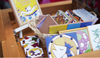 女川町の住宅や街角で使用されている「みなとまちセラミカ工房」のスペインタイルはお土産に人気。【妹尾和子 = 文、竹居鉄也 = 撮影】