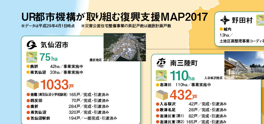 大震災から6年。復興の槌音は、確実な響きとなって被災地にこだましています。新たなまちづくりが進む東北3県のなかで、今回、本誌で紹介した6つの地区の、6年前と今の姿を写真でお届けします。