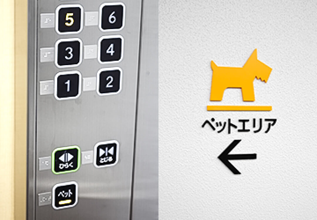 1号棟の47戸はペット共生住宅。ペットを大切にしている方も多く、災害公営住宅でもペットが住めるように配慮した。ペット共生住宅側のエレベーターにはペットと一緒に乗車することを知らせるペットボタンがある。名取市 蔵王を望む田園に高柳東団地完成