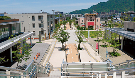 小倉駅から電車で約10分。JR日豊本線城野駅北口から真っすぐ延びるペデストリアンデッキの先には、歩行者や自転車が行き交う道「エコモール」が続いている。左右の街路樹の緑が鮮やかな、まちのシンボルロードだ。