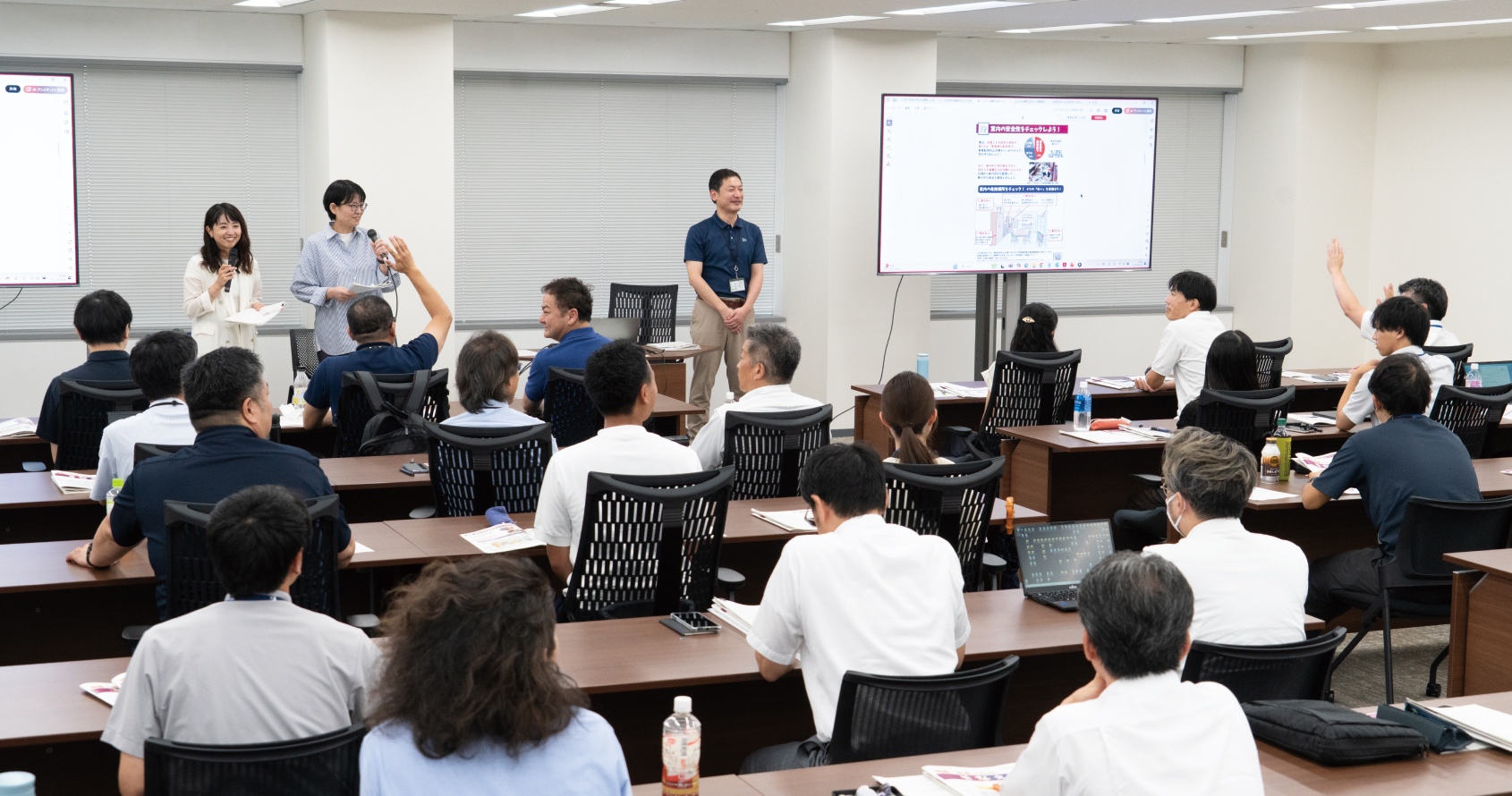 9月18日に開かれた、UR及びグループ会社の職員に向けた防災研修。ガイドブックを軸に展開した。説明を担った、左からいのちとぶんか社の葛西優香さん、MALCAの濱口加津子さん、UR住宅経営部の錦織靖基。UR賃貸住宅にお住まいの方を対象に行ったアンケートでは、「災害への対策が必要だと思うけれど、何から手をつけていいかわからない」「きっかけがない」という回答が多くありました。