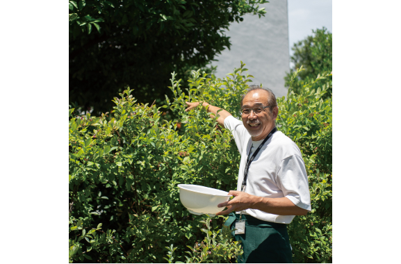 コミュニティーガーデンでブルーベリーの実を摘む作山教授。