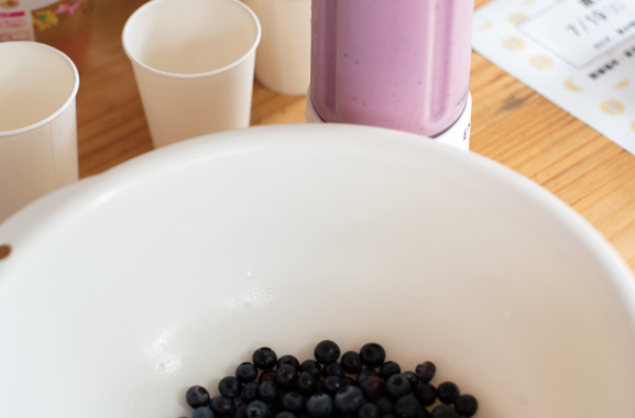 ブルーベリーはスムージーにして原市カフェで試飲。 自治会長の栗田さん。