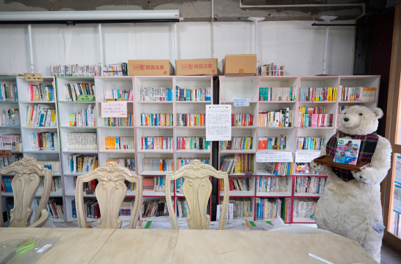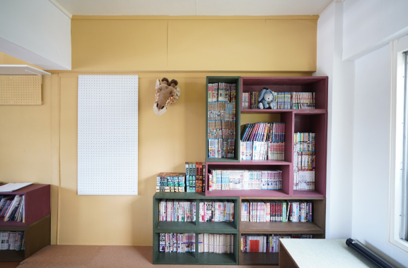 サテライトラボの2階には、コミックなどを座って読めるコーナーが設置されている。 原市団地では学生たちの微笑ましい光景を見ることが多いと話すURの森村。