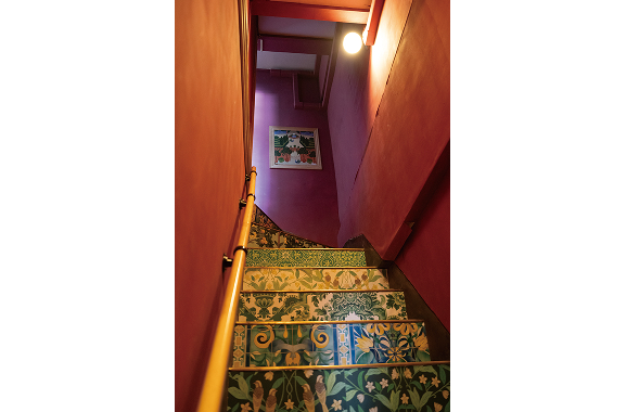 ペンキの色にこだわった、サテライトラボの2階の壁。 ラボの2階への階段はウィリアム・モリスの壁紙とフランスのペンキでオシャレに。