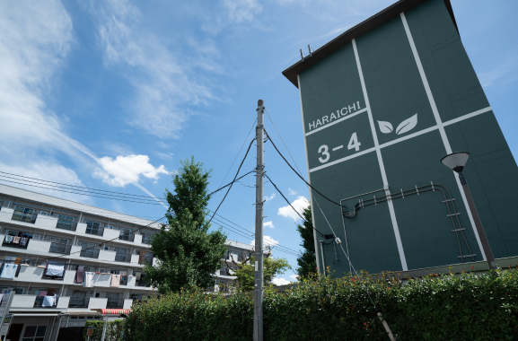 ラボの2階への階段はウィリアム・モリスの壁紙とフランスのペンキでオシャレに。 1966(昭和41)年に管理開始した原市団地。外壁塗装や外付けエレベーターの設置などを実施している。