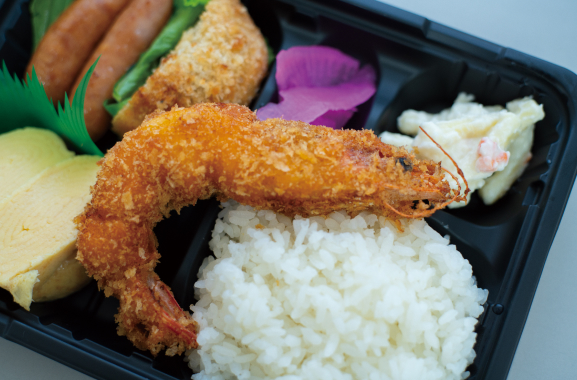 「こんな大きなエビフライ、食べたことない」と子どもたちが大喜びした本日のお弁当。
