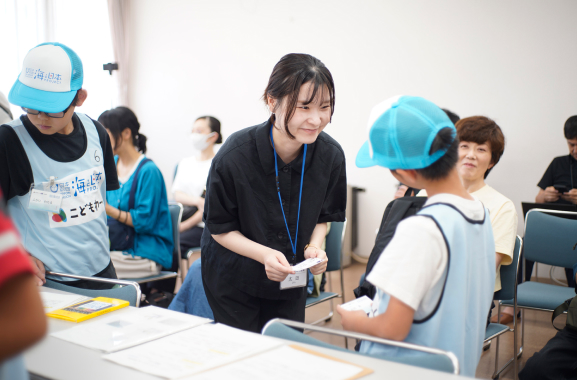 この日の「陸上養殖プログラム」は、まずURがなぜ陸上養殖に挑戦するのか、そのねらいや方法などを集会所で学んでから、実際の養殖現場へ移動。管理を担当する割石(わりいし)博明さんに教わりながら、子どもたちは水槽からエビの脱皮殻をすくいとり、餌やりを体験。