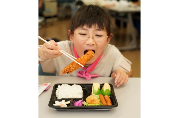 無事に任務を終えた子どもたち。最後は「ちーさん家」特製のお弁当が待っていた。もちろんおかずは団地で育った大きなエビフライ。新鮮なエビは、頭からしっぽまでおいしさが詰まっていた。