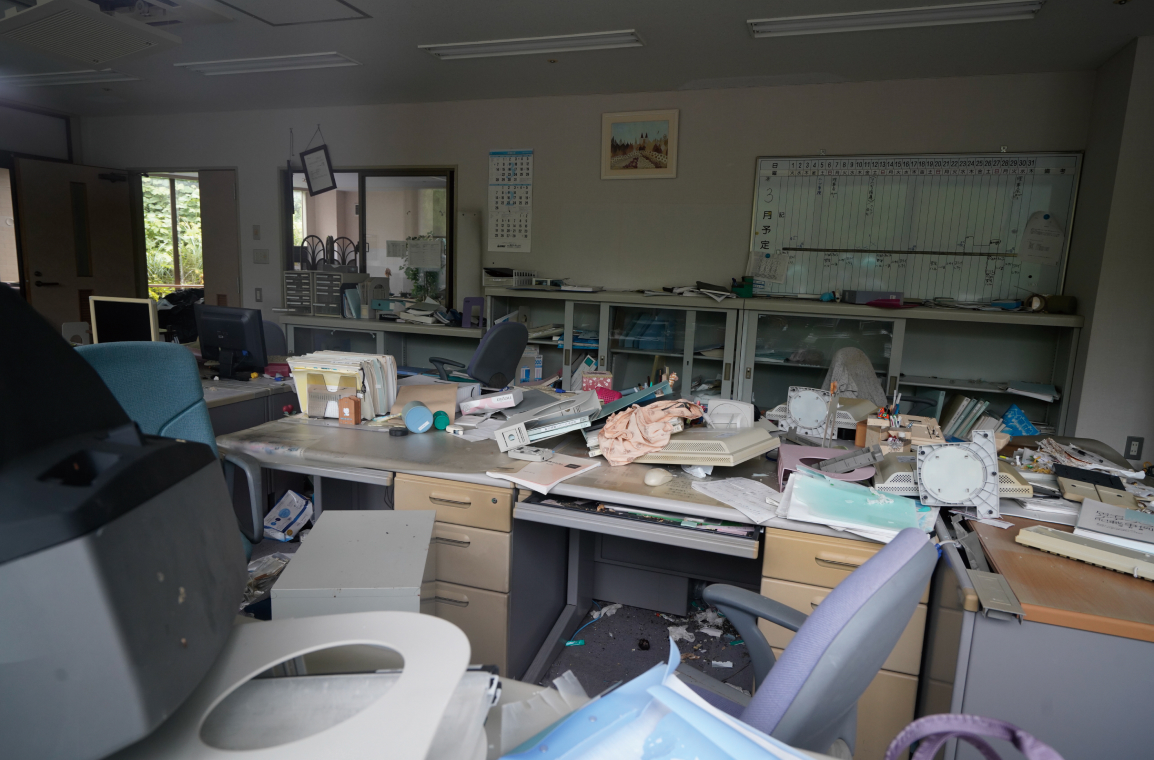 ここは帰還困難区域に指定され、見学会に参加しなければ入ることはできない。そのなかに介護施設の建物が残っていた。慌ただしく避難した事務所、放置された車。ここの時計は14年前に止まったままだ。