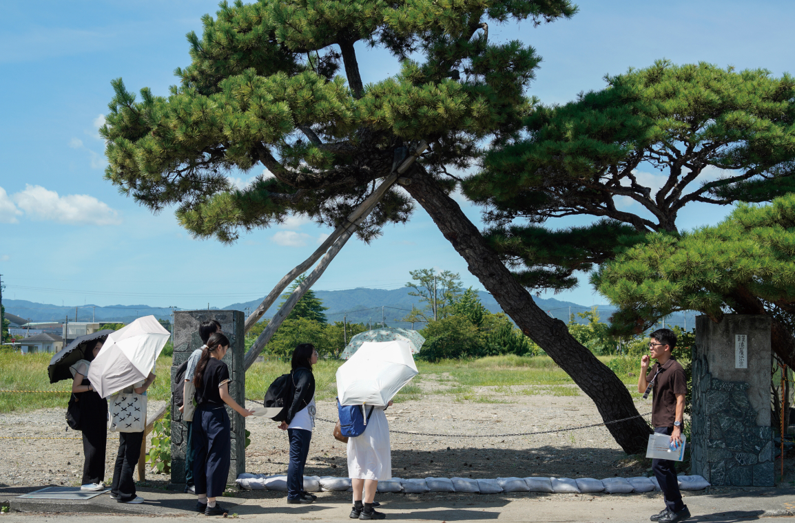JR浪江駅からまちを歩くと、校門と松の木だけが残った小学校跡地があった。 浪江のまちを歩き、URが運営する情報発信交流スペース「なみいえ」に立ち寄った。たくさんのイベント予定が書き込まれた「なみ☆カレ」に見入る学生たち。
