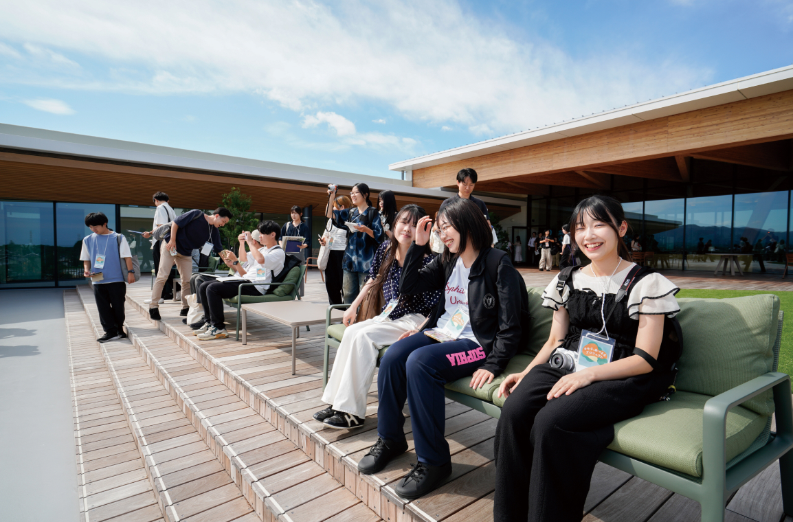 JR大野駅前に完成した、大熊町大野駅西交流エリアを視察。 大野駅前に今年3月に完成した産業交流施設「CREVAおおくま」。3階のテラスでひと休みする学生たち。