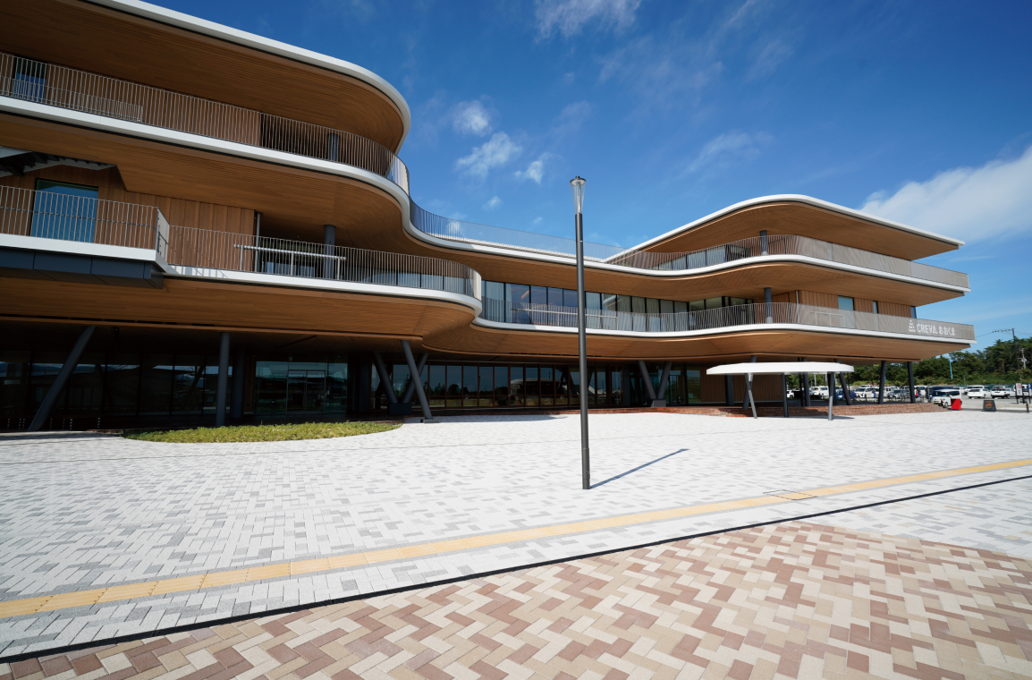 カーブが美しい「CREVAおおくま」。 大熊町の地域プレイヤーの谷田川さん(右)と南場さん。