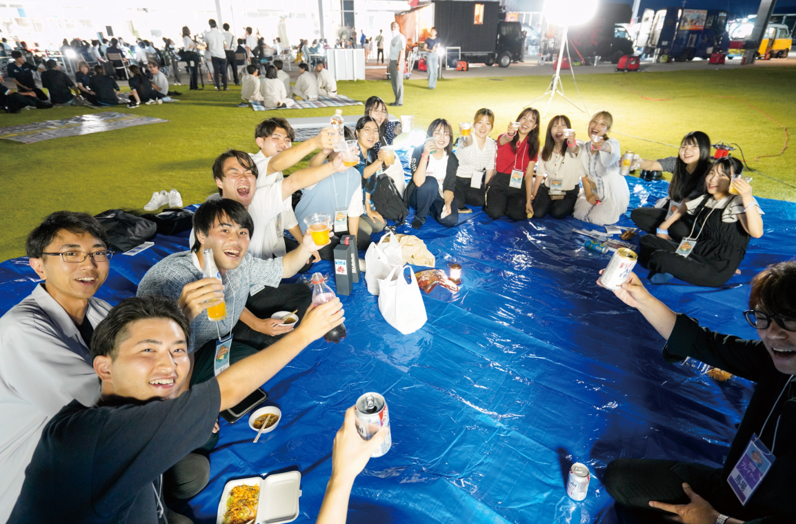 終了後は産業交流センター広場で「ふたば飲み・ちいさな一歩プロジェクト」へ。この日と翌日の2日間、「ふたば星空夜市」が開催され、復興に関わる人たちや避難先から戻った人、移住した人たちなどが車座になって楽しむなか、学生たちも双葉の夜を満喫した。