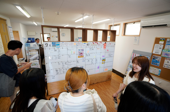 浪江のまちを歩き、URが運営する情報発信交流スペース「なみいえ」に立ち寄った。たくさんのイベント予定が書き込まれた「なみ☆カレ」に見入る学生たち。大熊町