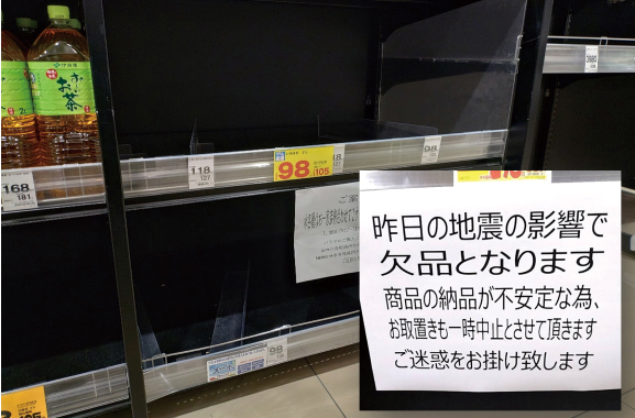 2024年8月8日の「南海トラフ地震臨時情報」発表直後に、飲料水などが買い占められてしまった店舗の様子。日頃からの備えを行うことで、突発的な情報に対処できます。