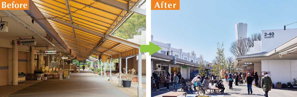 花見川団地(千葉県千葉市)の商店街の改修前(左)と、改修後(右)。「MUJI×UR 団地まるごとリノベーション」により、明るく、人々が滞留できる空間に生まれ変わった。時代の変化に合わせ、築年数の経った団地を必要に応じて更新する取り組みを、URはさまざまなかたちで行っている。高層住棟に建て直して住戸を集約し、空いた敷地に施設を誘致したり、公園を設けたり。また、住棟はそのままに、住戸をリノベーションして、新たな魅力を備えたり……。