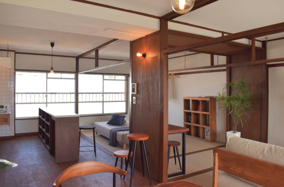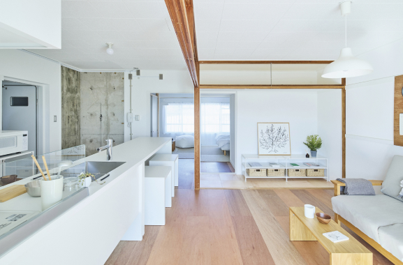 高蔵寺ニュータウン(愛知県春日井市)のリノベーションプロジェクト。構造壁のない居室、東西の大きな連窓など既存住宅の特徴を生かして、広々とした間取りに変更している。(株)URリンケージが企画・監修、団地デザインユニット「Danchitects」が企画協力。