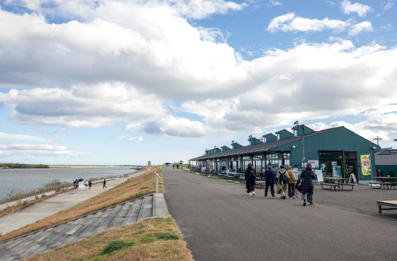 名取市の復興のシンボル「かわまちてらす閖上」。名取川の雄大な流れを間近に感じられるロケーションだ。