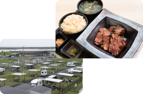 上/牛タンの希少部位を丁寧に焼き上げた「極上タン塩定食」(3枚9切れ、3,900円)。下/敷地内にはRVパークが完備。手ぶらで牛タンバーベキューを楽しめる。