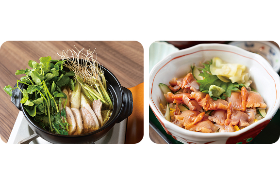 右/ぜいたくな「赤貝丼定食」(3,960円)。ほかに赤貝の刺身や寿司もある。左/名取の冬の風物詩「鴨肉せり鍋」(小鍋3,080円)。名取市はせりの一大産地だ。