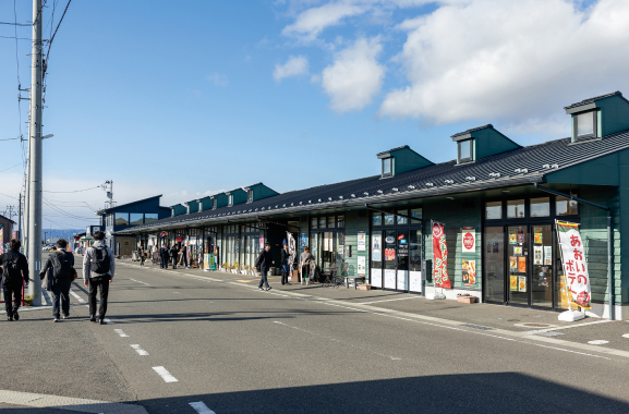 「漁亭 浜や」もある「かわまちてらす閖上」。新鮮な海の幸が楽しめる食事処をはじめ、笹かまぼこ店やスイーツ店など、約30店舗が軒を連ねている。ご当地グルメを楽しもう。