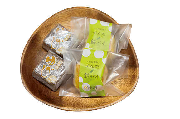 もち米を使用した甘仙堂の伝統菓子「ゆべし」(1個140円)。「ずんだ餅パイ」(1個259円)は、ずんだ餡の和洋折衷スイーツ。