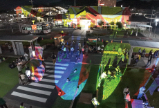 URがまちづくりを支援する熊本県荒尾市のJR荒尾駅前で、昨年10月に開催された「のあそびマルシェ×DK(デジタル掛軸)」の様子。社会実験として、夕方以降の人の動きを検証した。