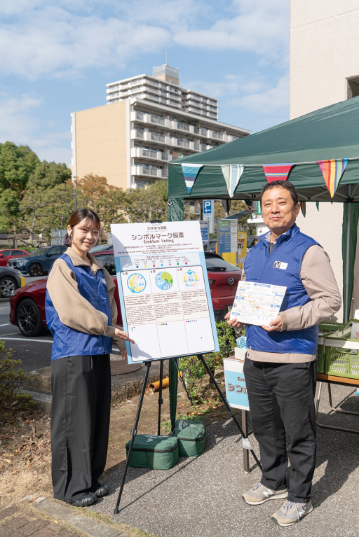 イベントでは「わがまち清新」のシンボルマークの投票も行った。担当するURの長尾(右)と鈴木。
