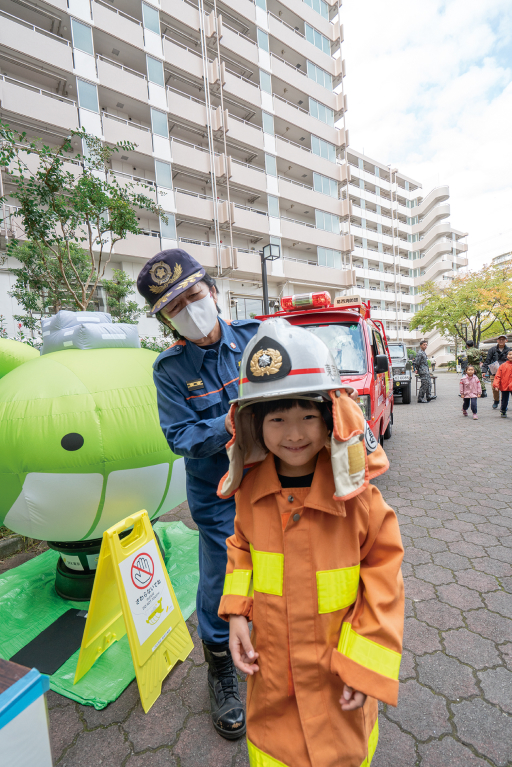 コーシャハイム清新の中庭では、消防車試乗体験や、消防服での記念撮影が子どもたちに人気。【武田ちよこ=文、平野光良=撮影】