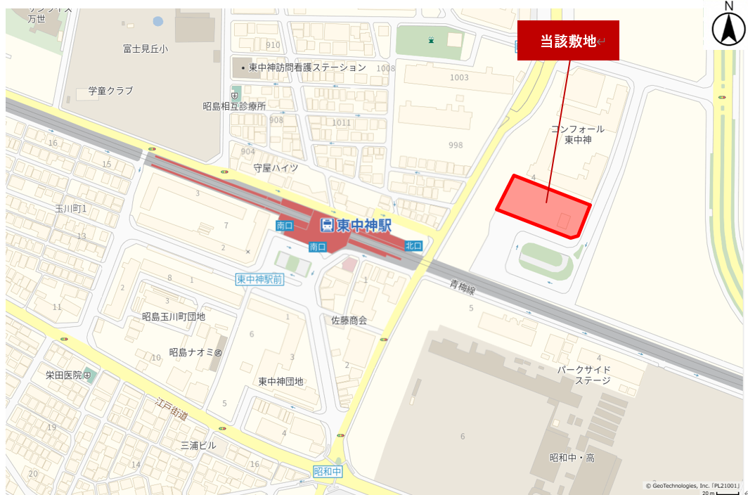 | 備考 | ・「東中神駅周辺地区住宅市街地整備計画」重点整備地区内 ・立川基地跡地昭島地区 地区計画区域(複合利用A地区・にぎわい交流拠点) ・立川基地跡地昭島地区民間利用街区まちづくりガイドライン策定区域(複合利用A-1地区) ・敷地西側の昭島都市計画道路3・2・11号公営公園西線は事業中。アンダーパス化予定。 |