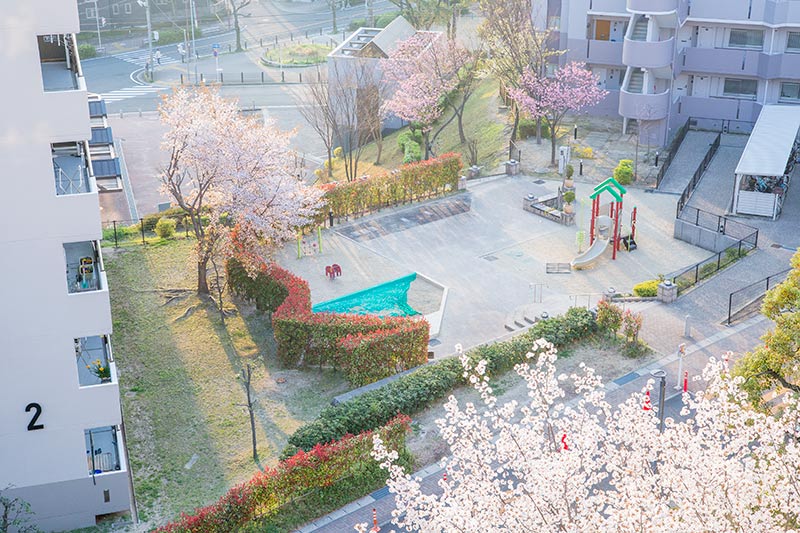 すぐそばには公園もあり、星ヶ丘エリアの中でも緑豊かな街なみが魅力。春は団地の中は桜に彩られ、子どもたちも一緒に敷地内の広場でお花見も楽しめます。また「虹ヶ丘」ということで虹色に塗り分けられた建物に、桜の淡いピンクが優しく映えます。