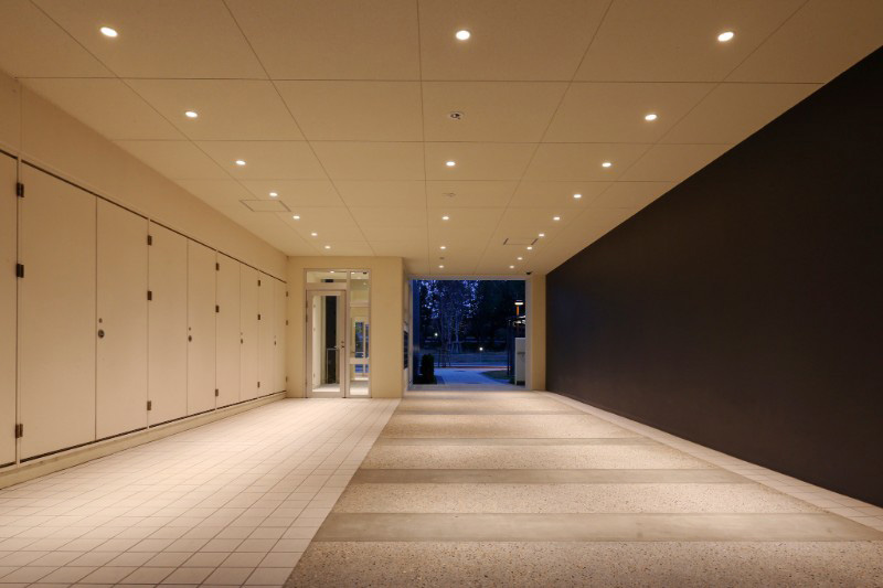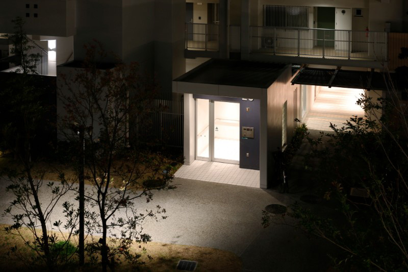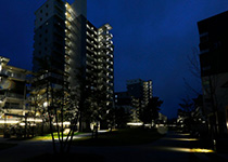 「ホームタウンとしての光」を目指した照明デザインで、心からリラックスできる空間をつくる「浜甲子園なぎさ街」。敷地内の所どころに、小さな光を集めたような“光だまり”を設け、自然に人が集まるような雰囲気を演出しています。また、豊かな緑や壁面をライトアップした敷地内は、まるでリゾート地のような佇まいです。そして、エントランスへと続く歩道に浮かぶ青い光は、海のすぐそばに建つ団地の印象をより深めてくれています。