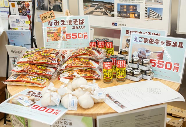 岩手県のブースは「三陸鉄道」のコーナーが目を引きます。ほかにも、「満福農園」のトマトジュース、老舗の菓子屋「志たあめや」のかりんとう、「清水商店」による白樺樹液を使用したドリンクや岩手県産100%蜂蜜、しょうゆやみそを製造している「八木澤商店」の各種調味料、「釜石振興開発」の三陸ラーメン各種、「古須賀商店」による海草加工品といった商品が集まっていました。