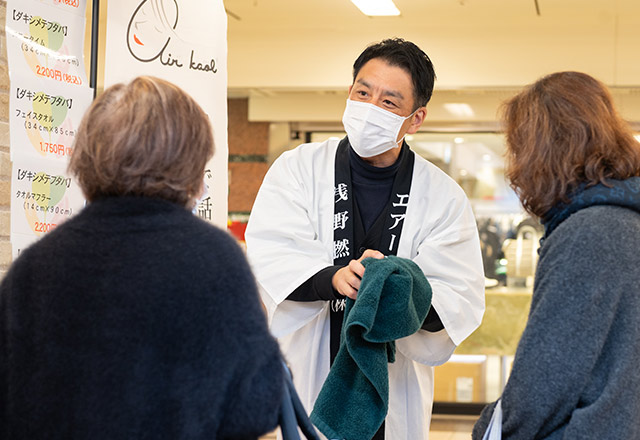 「浅野撚糸」は、社員が店頭で接客。看板商品である「エアーかおる」の説明をしていました。