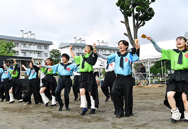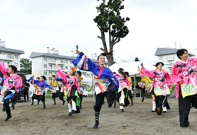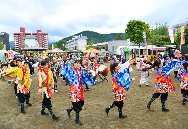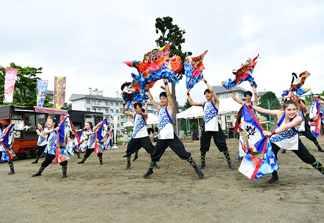 広場を熱気で包んだのは、迫力あるよさこいステージ。北海道大学、北海道武蔵女子大学、北海学園大学の学生で構成される「テスク&祭人」と、「和と粋」をコンセプトに活動している「北海学園大学『粋』」の2グループが演舞を披露しました。