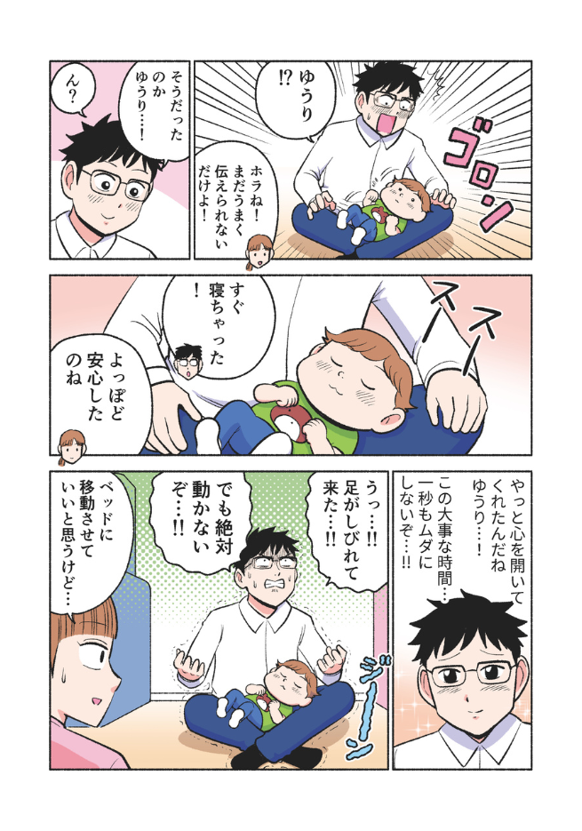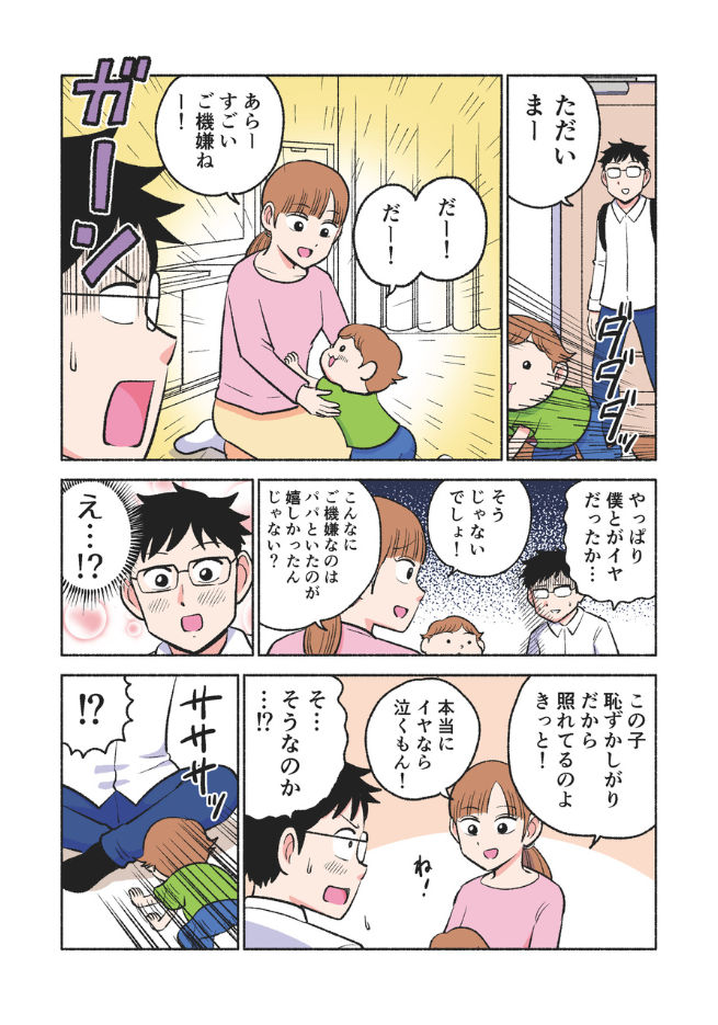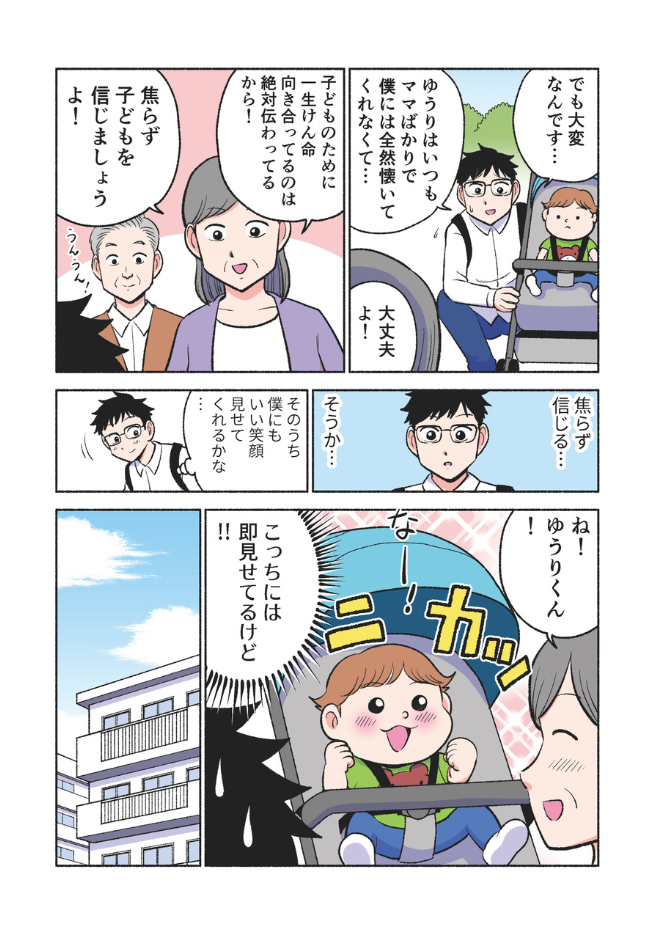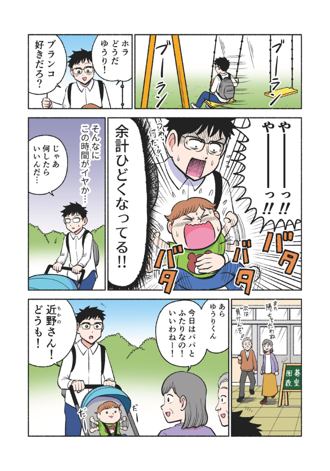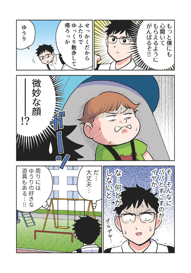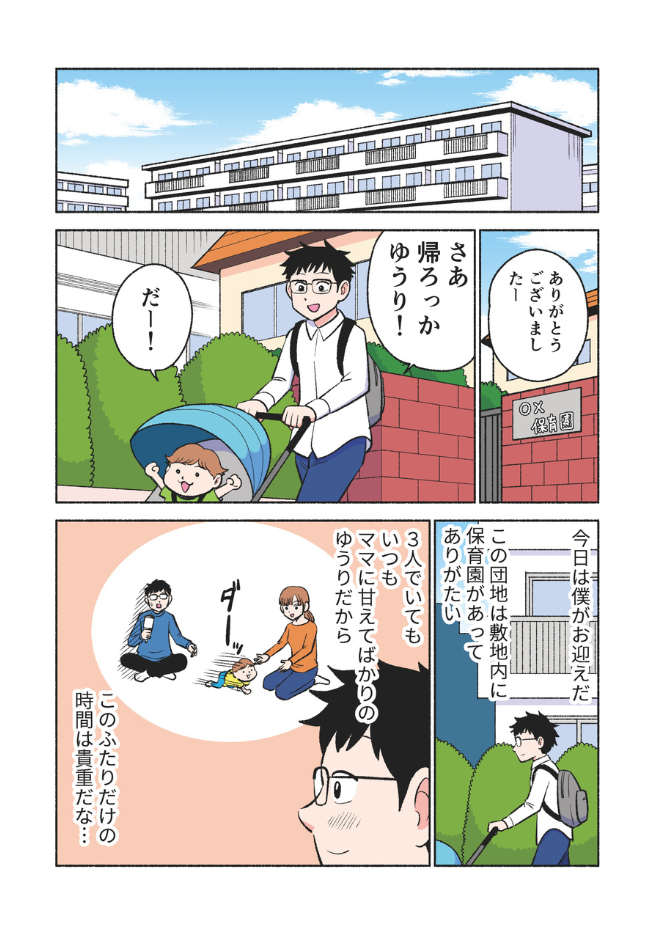 息子にもっと心を開いてもらいたいパパと、パパが大好きなのに、うまく甘えられないゆうり。保育園帰りのわずかな時間は、二人にとって大切なひとときです。