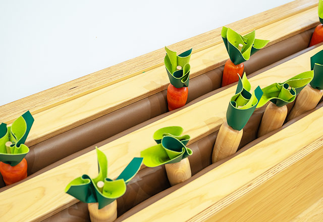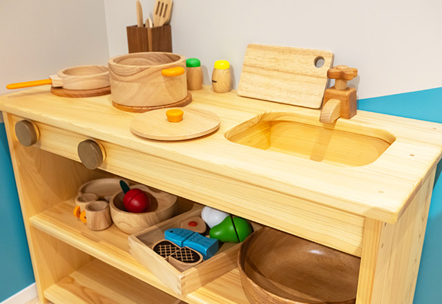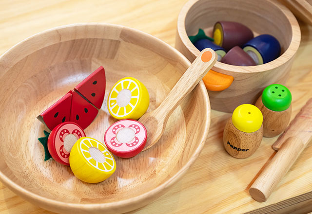 店先に並べてお店屋さんごっこをしたり、木の包丁や鍋を使っておままごとを楽しんだりと、遊びの世界がさらに広がります。