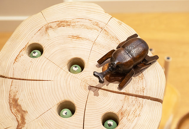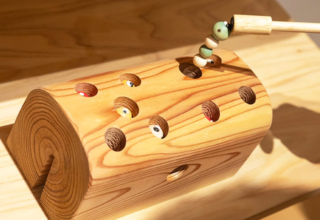 一角には、「グッド・トイ」の中でも、埼玉県内で活動するおもちゃ作家や工房の作品を集めたコーナーもあります。木の穴に隠れた芋虫を磁石付きの棒で引っ張り出す「ひっつきむし」や、おもちゃのどんぐりを坂道に置いてとことこ歩かせる「どんぐりころころ」など、「WEST」の遊び場でも人気のおもちゃも紹介されています。