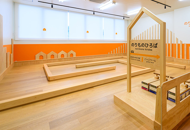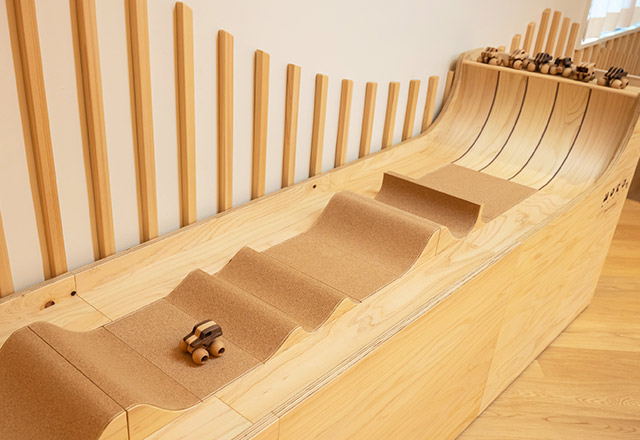 ほかにも、木製のミニカーを専用コースで走らせることができるなど、体を使って夢中で遊べる仕掛けがいっぱいです。