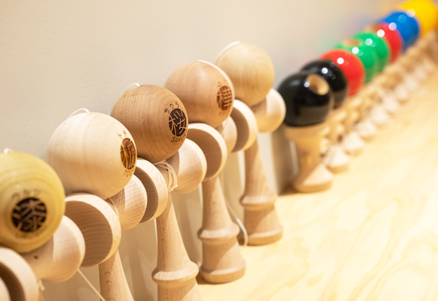 独創的なデザインのこまや、10連けん玉、競技用けん玉「大空」などがバラエティー豊かに取りそろえられています。
