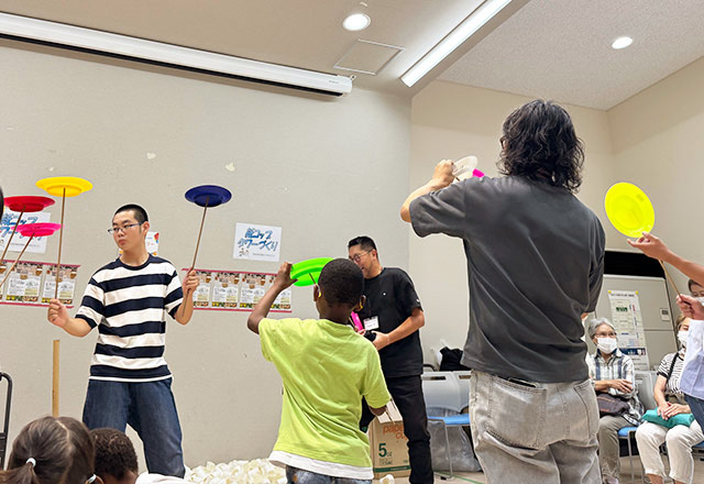 「埼玉おもちゃ美術館」のオープンに先立ち、2025年7月にはみさと団地の集会所でイベント「おもちゃの広場@みさと団地」が開催されました。さまざまなおもちゃや、手作りワークショップ、大道芸などもあり、都内の美術学校(東洋美術学校)の学生さんも参加しました。たくさんの来場者でにぎわいました。