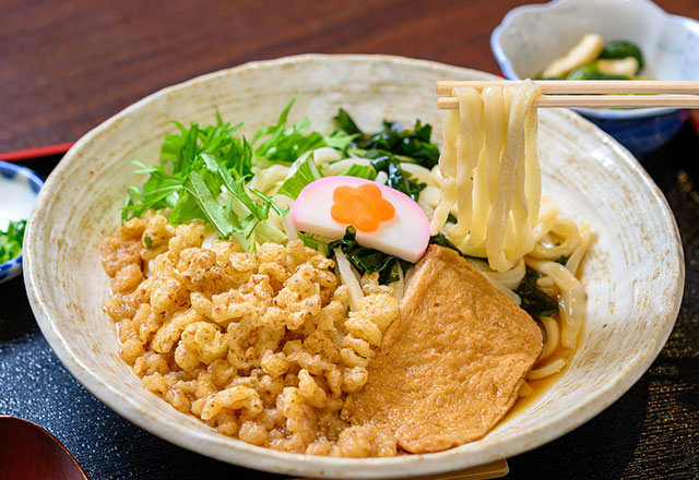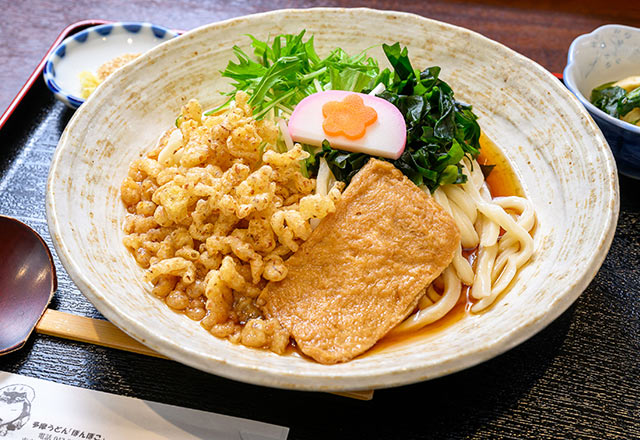 • ・「わがままうどん」は、サクサクの揚げ玉と油揚げがのったひと品。揚げ玉は生のマイタケを混ぜ込んで個別に揚げたオリジナル
